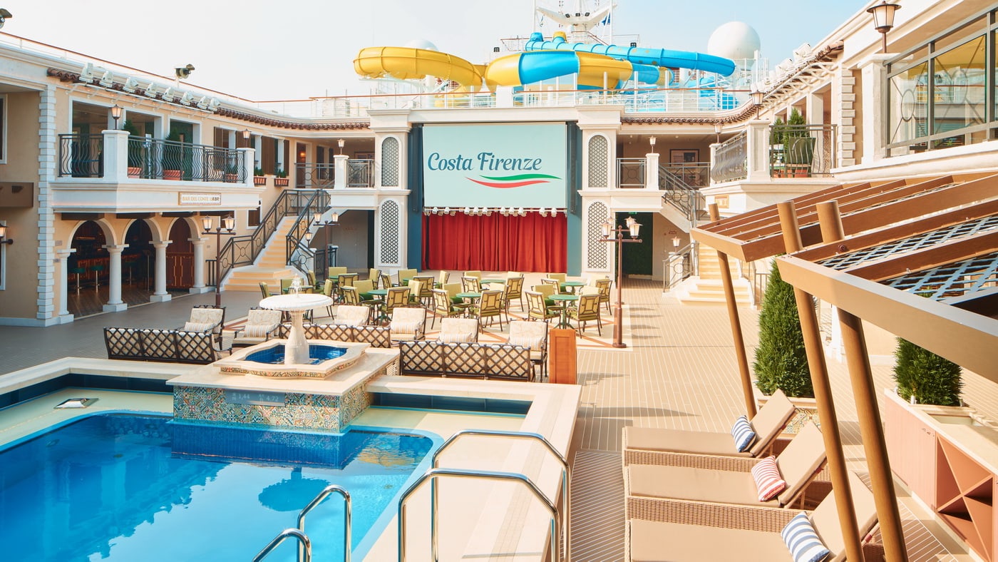 Das Innendesign der Costa Firenze wurde von der gleichnamigen Stadt in der Toskana – der Heimat von Kunst und Kultur in der Renaissance – inspiriert. Die Gemeinschaftsbereiche sollen den Gästen das Gefühl geben, sie würden durch eine Straße oder über einen Platz in Florenz spazieren.