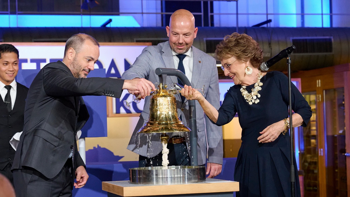 Im historischen Hotel New York – dem ursprünglichen Firmensitz – präsentiere Holland America Line eine Jubiläumsglocke, die künftig dauerhaft im Hotel ausgestellt wird. Einer alten Tradition folgend, übernahm Prinzessin Margriet der Niederlande, die auch Taufpatin der MS Rotterdam VII ist, die Glockenweihe und übergoss sie gemeinsam mit Gus Antorcha – Präsident von Holland America Line – mit einem Glas Champagner.