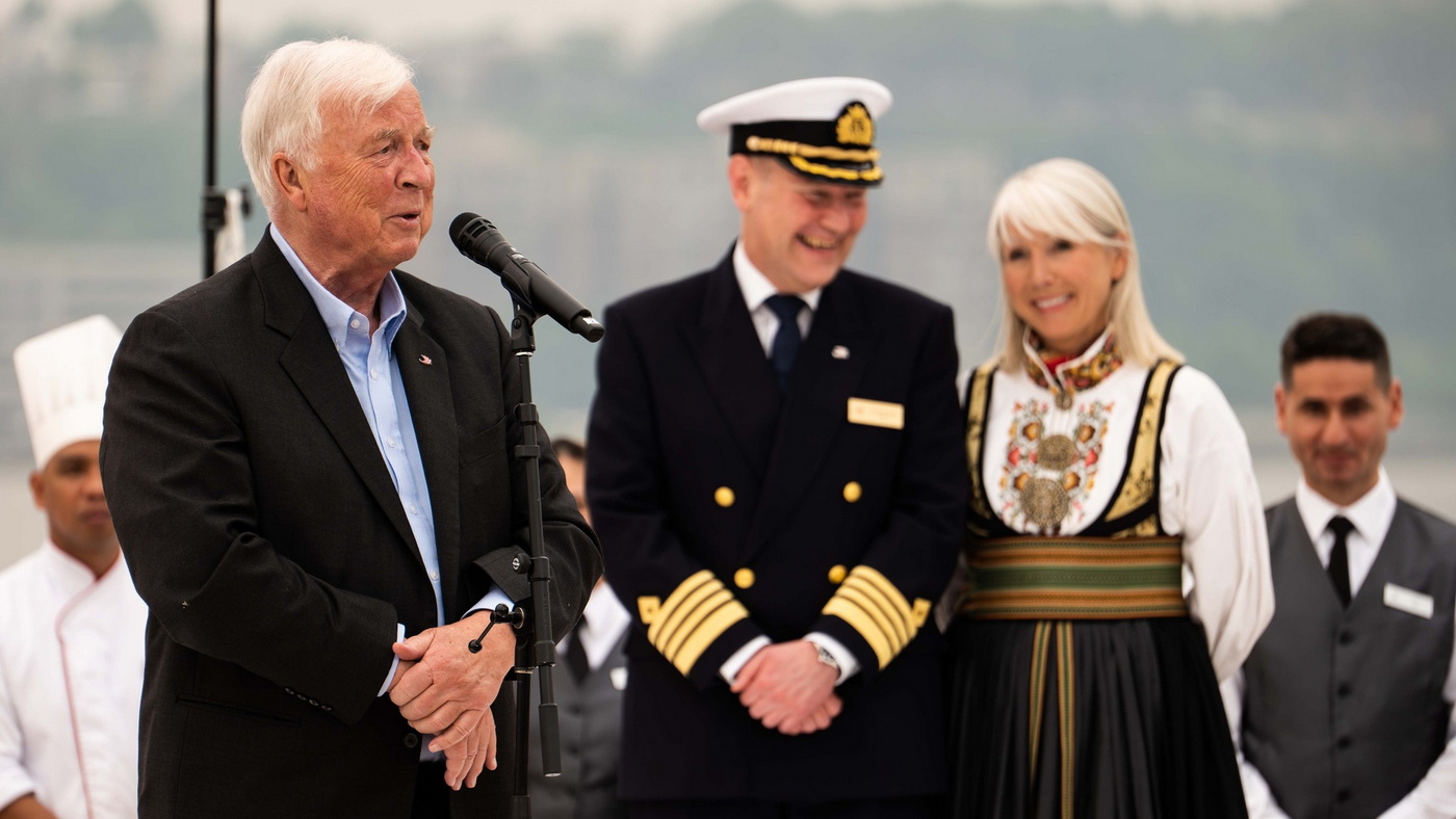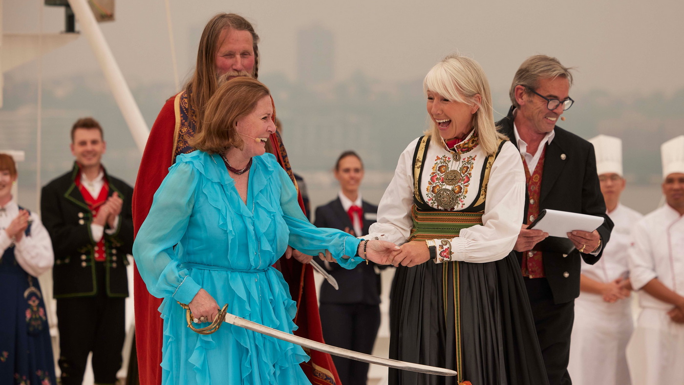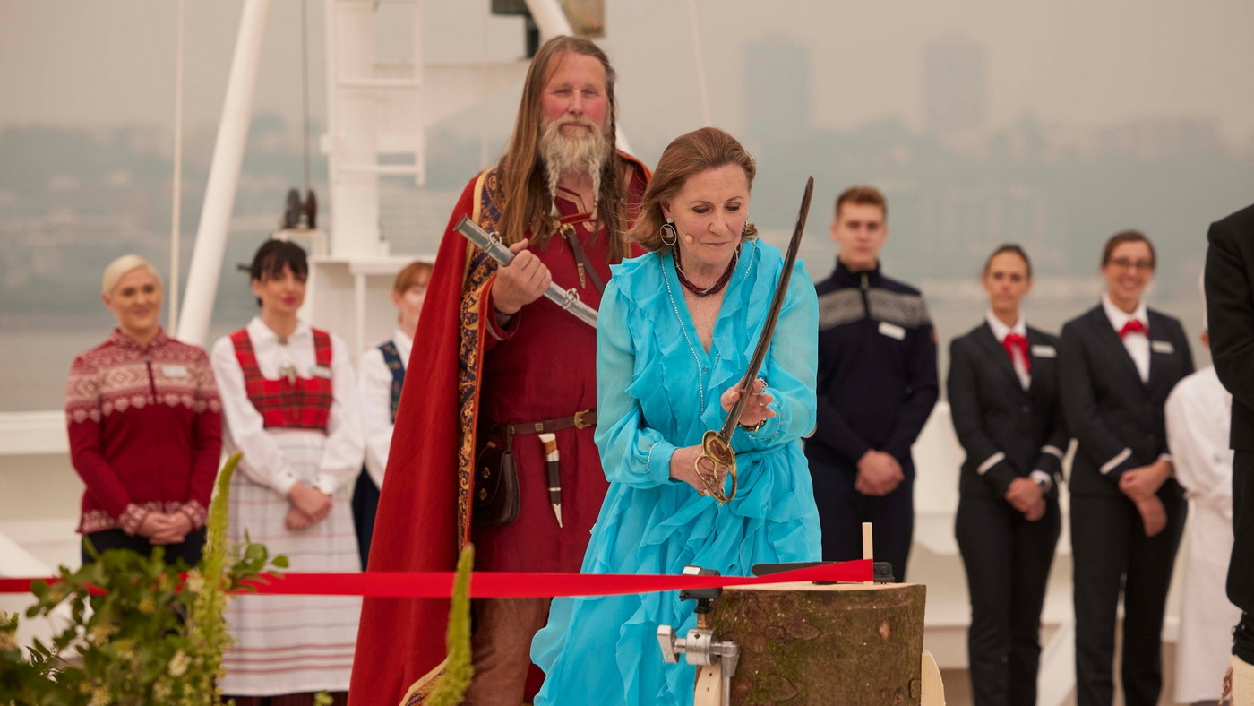 Entsprechend der Tradition der Viking-Schiffstaufen benutzte Ann Ziff während der Zeremonie ein Stahlschwert, um ein Band zu zerschneiden, das eine Flasche norwegischen Aquavit auf dem Schiffsrumpf zerschellen ließ. Das Schwert wurde ursprünglich in der Spielzeit 2008/09 von Bariton Dmitri Hvorostovsky in einer Produktion von Verdis „Il Trovatore“ an der Metropolitan Opera verwendet.