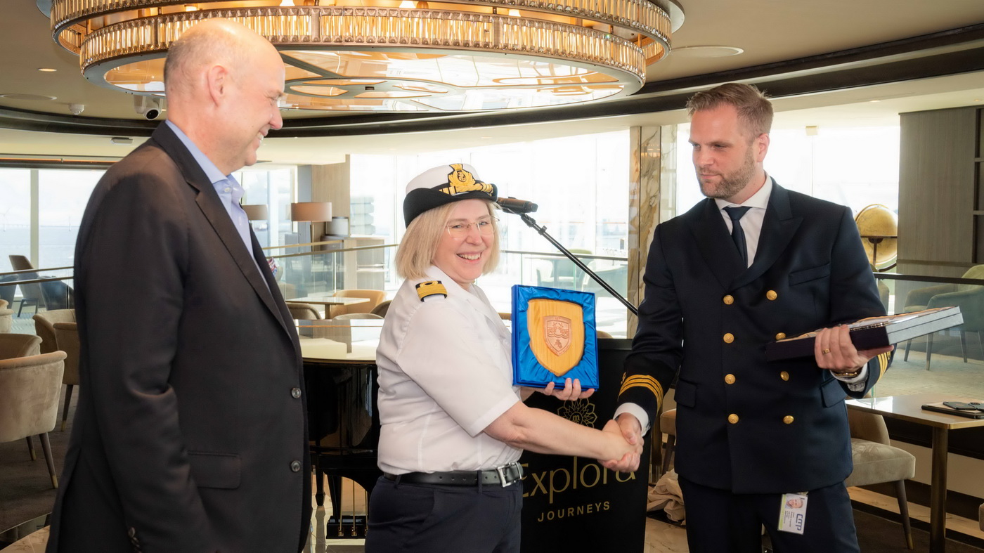 Zu den Feierlichkeiten in Kopenhagen gehörte auch der traditionelle Austausch des Wappens – eine maritime Tradition, mit der der erste Besuch eines Schiffs an einem Zielort gefeiert wird. Mit dabei: Kapitänin Serena Melani, der stellvertretende Hafenkapitän Johan Hoganfalt, Sune Christensen (CCO Copenhagen Malmö Port), Klaus Bondam (Direktor von Cruise Baltic und Cruise Copenhagen) und Michael Ungerer (CEO von Explora Journeys).
