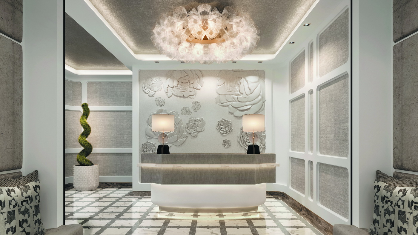 Das Serene Spa & Wellness an Bord der Seven Seas Grandeur, das vom preisgekrönten Studio DADO entworfen wurde, bietet ein multisensorisches Erlebnis, das den Gästen umfassende Entspannung verspricht. Ein florales Motiv im Eingangsbereich zieht sich durch den gesamten Raum.