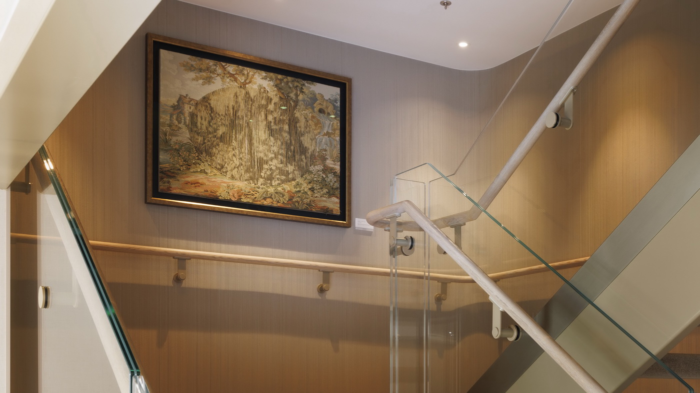 Die künstlerische Gestaltung der Suiten-Korridore setzt die Erkundung von Geschichte, Kultur und Natur fort, die in den Treppenhäusern zu finden ist. Fotografien des langjährigen Silversea-Botschafters Steve McCurry an zentralen Punkten, zusammen mit einer Vielzahl von Karten aus dem Theatrum Orbis Terrarum, das als erster echter moderner Atlas gilt, schaffen einen Dialog zwischen Vergangenheit und Gegenwart. Jeder Suiten-Korridor, von Deck 6 bis Deck 9, ist einer bestimmten geografischen Region gewidmet. So ist Deck 6 Europa gewidmet, Deck 7 Asien, Deck 8 Afrika und Deck 9 Amerika.