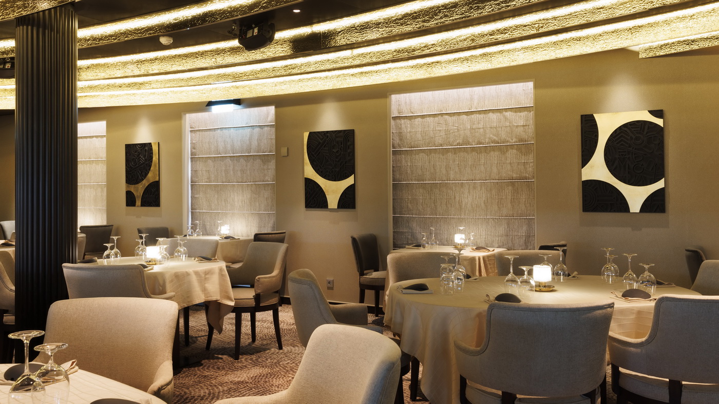 In der verborgenen Bibliothek auf Deck 10 hat der albanische Künstler Artur Sula ein beeindruckendes Wandgemälde geschaffen, das die Besucher dazu einlädt, das Meer zu betrachten und tief in die Konstellationen des Nachthimmels zu blicken. Das 280 Quadratmeter große Werk wurde von Hand gemalt und mit 24-karätigem Blattgold veredelt.