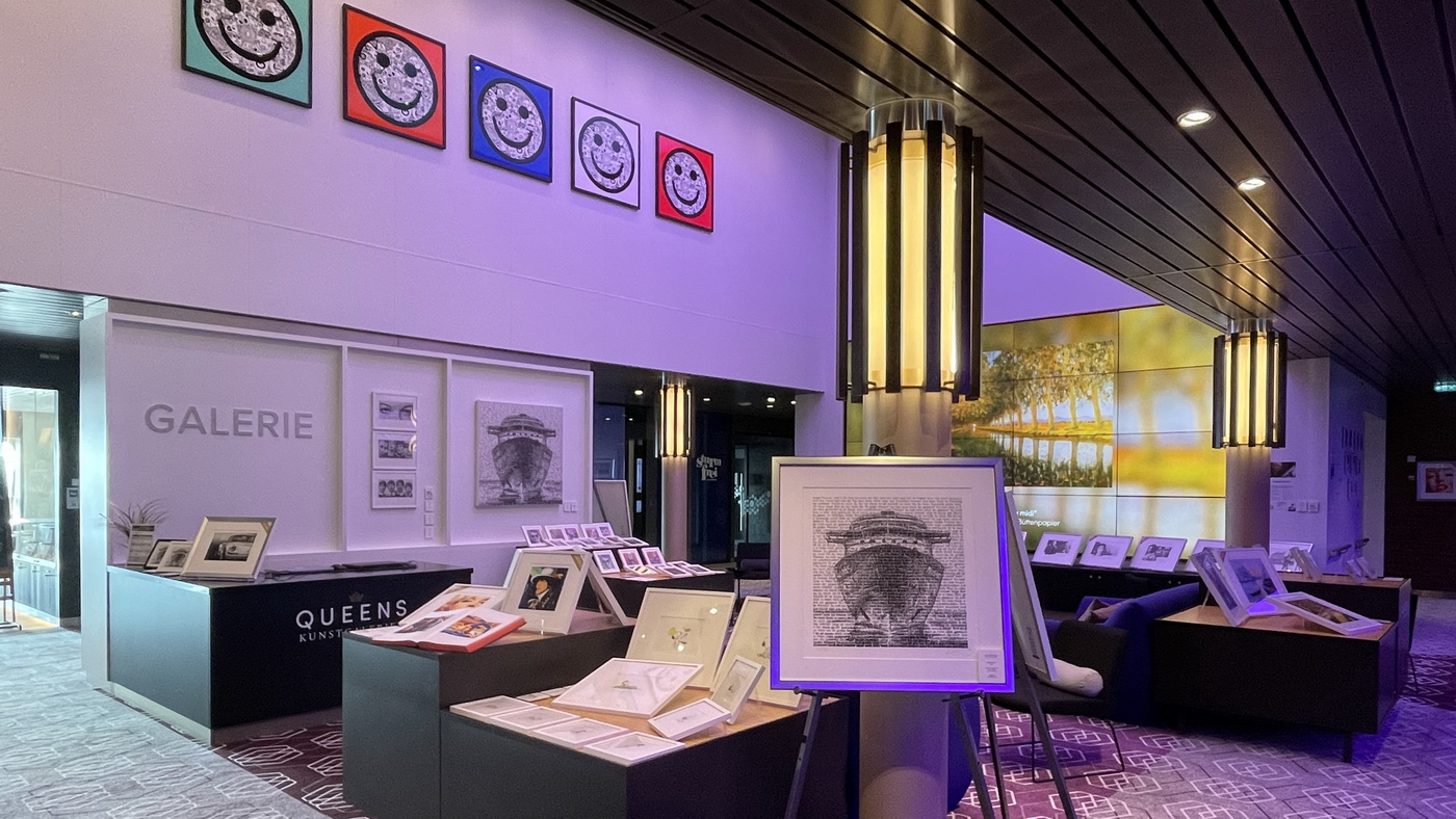Im frisch renovierten Galeriebereich auf Deck 4 können Kunstinteressierte nicht nur Fotokunst, sondern auch hochwertige Kunstdrucke, ausgewählte Unikate und Skulpturen bewundern und zur Erinnerung an ihre Zeit an Bord erwerben. Queens Kunstgalerien haben sich auf moderne und zeitgenössische Kunstwerke spezialisiert. Sie arbeiten eng mit etablierten und aufstrebenden Künstlern, wie beispielsweise Bob Dylan und James Francis Gill, einem Mitbegründer der Pop Art, zusammen. Doch auf Deck 4 hat nicht nur die Galerie eine Schönheitskur genossen, sondern beispielsweise auch der inmitten der Galerie gelegene Arbeitsplatz der Reiseberater sowie der Bereich der Landausflugsabteilung.