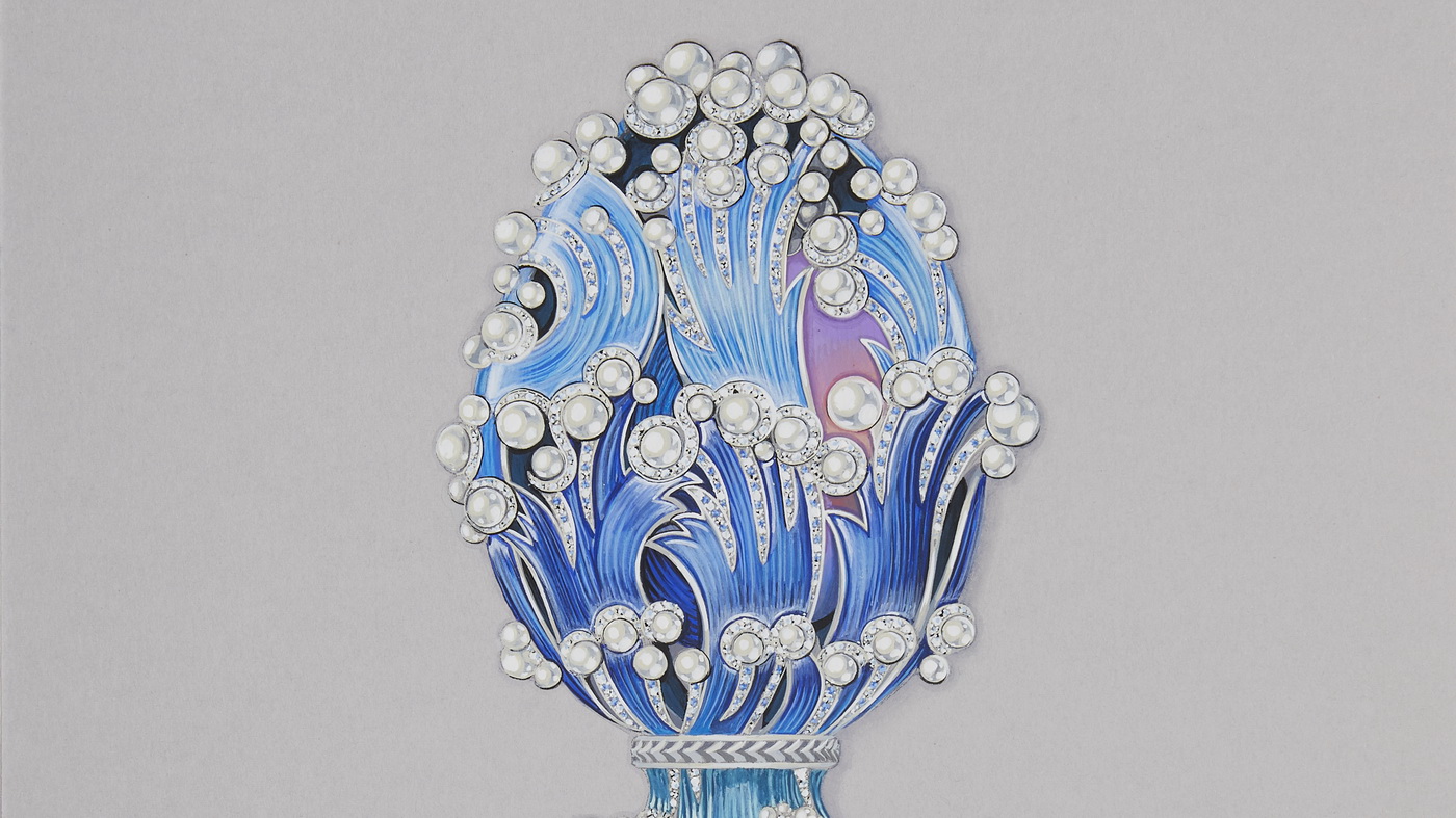 Die in England aus 18-karätigem Weißgold gefertigte äußere Schale des Eis wurde mit einer blauen Schattierung emailliert, die für die Farben des Meeres steht. Diese Schale besteht aus sieben verschlungenen Klingen, eine Zahl, die sorgfältig ausgewählt wurde, um die sieben Meere zu feiern, die die Schiffe von Regent durchqueren. Wie eine Welle bricht sich jedes Blatt an den Spitzen in einem Meeresschaum aus Perlen und weißen Diamanten. Somit entstand ein wahrhaft außergewöhnliches ästhetisches Kunststück.