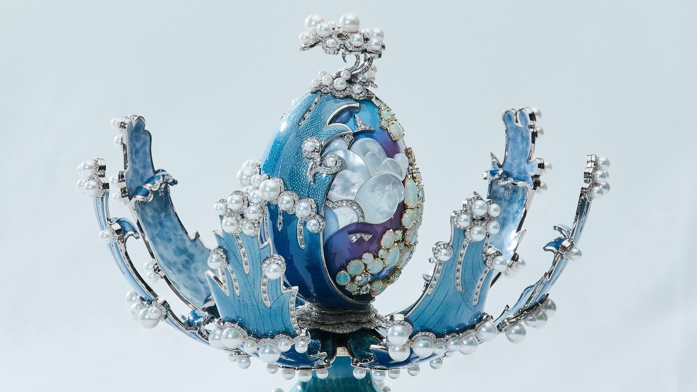 Dieses Ei ist außerdem mit einer Fülle von funkelnden Edelsteinen verziert, darunter ein atemberaubendes diamantbesetztes Reismuster, das sich um das Überraschungsei windet und vom Fabergé-Winterei von 1913 inspiriert ist. Handgeschnitzte Perlmutt-Wolken und weiße Opale in 18-karätigem Gelbgold sind ebenfalls zu sehen. Die Wärme des Gelbgolds erinnert an die Sonne und die Opale stehen für die Regenbögen, die durch den Zusammenprall des Wetters entstehen.