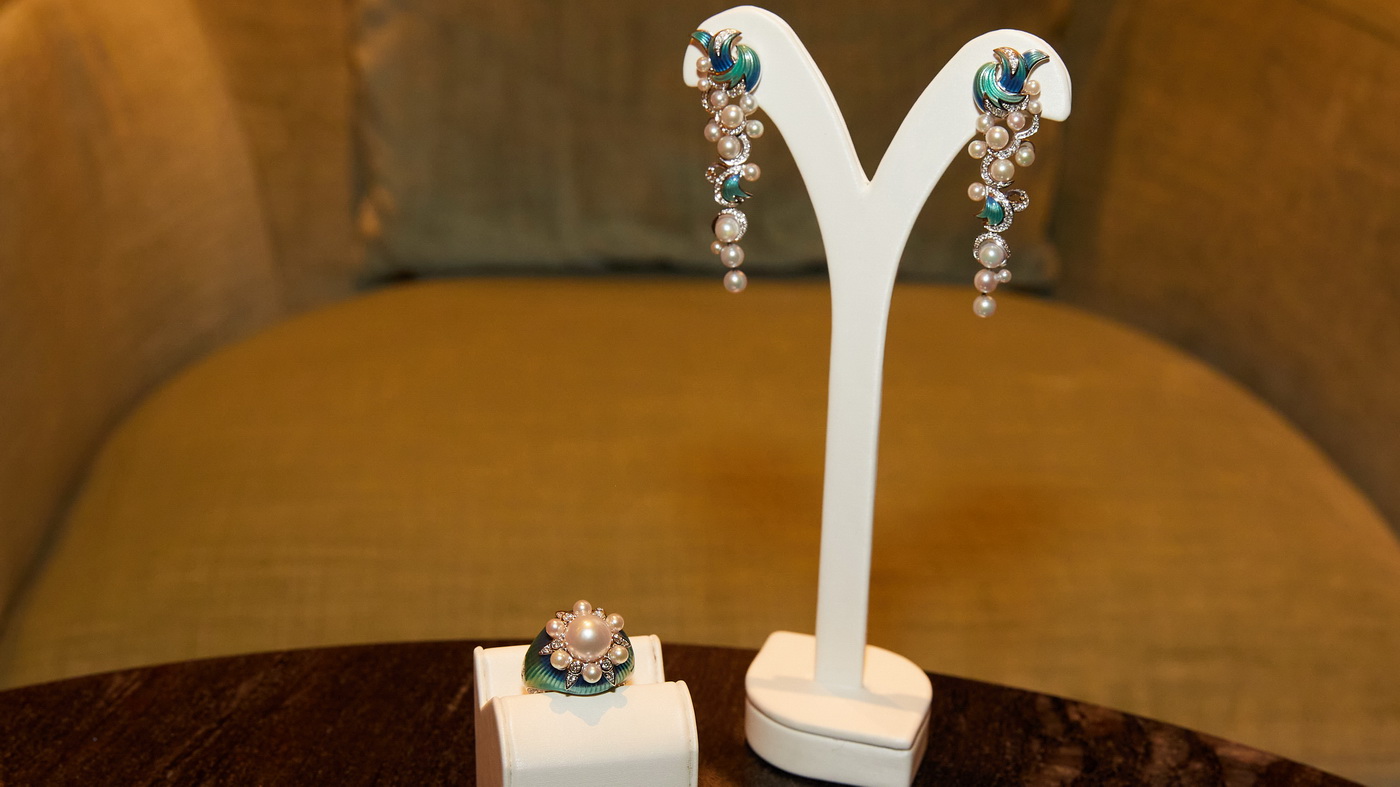Diese exquisiten Stücke aus 18 Karat Weißgold, die von Hand mit blauer Guilloche-Emaille bemalt und mit weißen Diamanten und Perlen besetzt sind, waren auf der Taufreise der Seven Seas Grandeur zu sehen und wurden während der Taufe zur Versteigerung freigegeben.