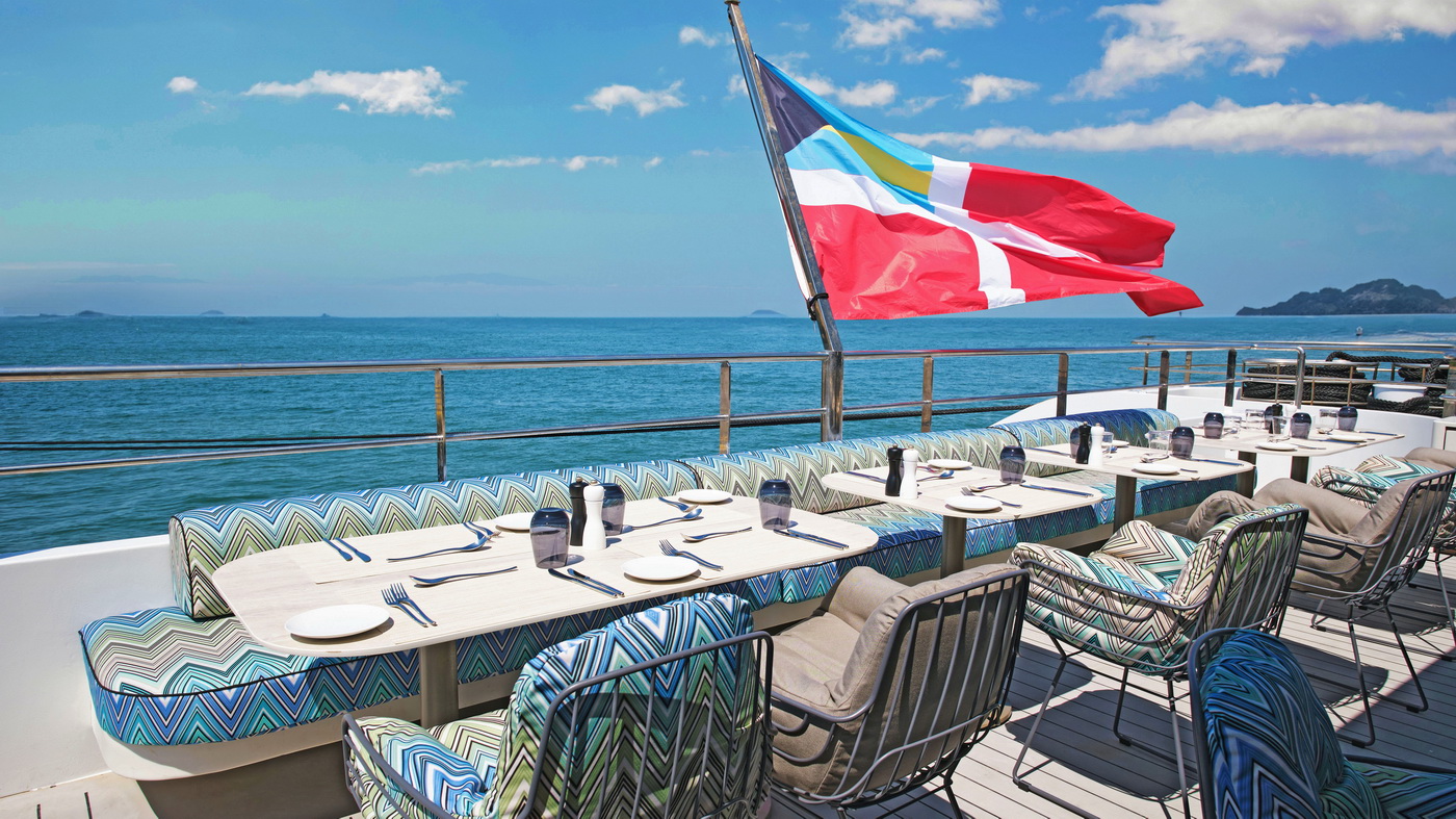 Am Heck der Yacht stehen Kajaks, Stand-Up-Paddleboards, Schnorchelausrüstung, SEABOBs und ein Riesentrampolin den Gästen zur Verfügung. Das La Cucina ist auf frische, saisonale Küche spezialisiert und bietet Sitzplätze im Innenbereich sowie auf der angrenzenden Terrasse, während die Amici Lounge als abendlicher Treffpunkt mit Live-Musik gilt.
