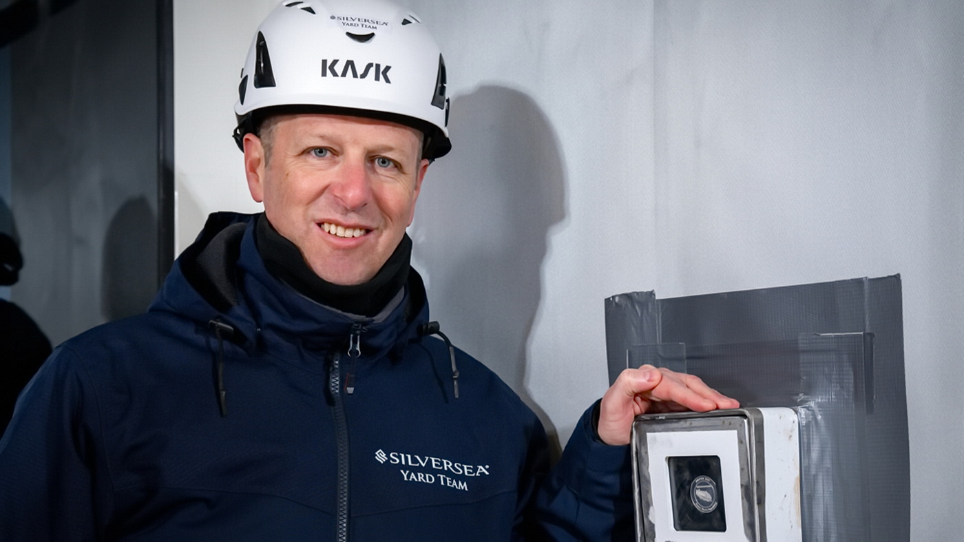 Anschließend montierte das Team den Schornstein und den Radarmast. In Anlehnung an die Traditionen des Schiffbaus schweißte Alessandro Zanello, der Kapitän der Silver Ray, als Glückssymbol eine Gedenkmünze an eine Wand des Pooldecks.