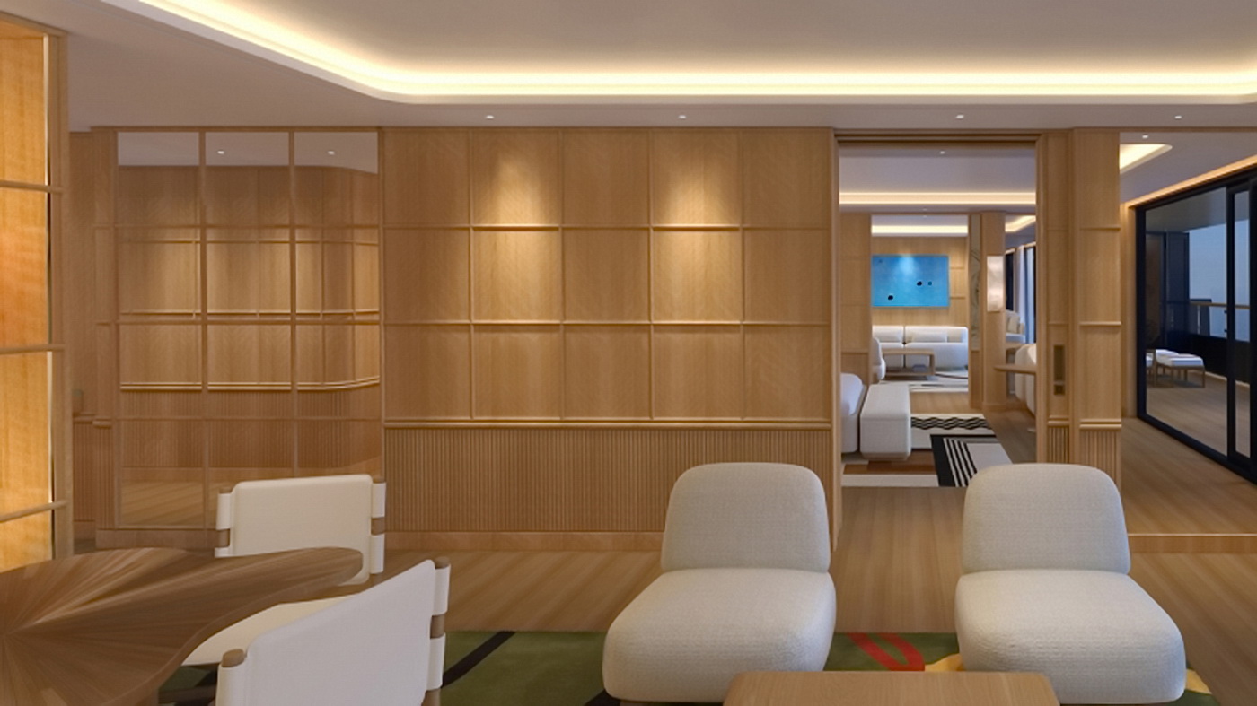 Diese Vielseitigkeit bietet auch die einzigartige Möglichkeit, eine ganze Seite eines Decks zu reservieren. Die Premium-Suiten der Yacht, die Loft-Suite und die Funnel-Suite, bieten Platz für bis zu 19 beziehungsweise 36 gemeinsam reisende Gäste. Darüber hinaus verfügen zwölf Suiten über separate, multifunktionale Studioräume mit separatem Eingang und eigenem Bad, die nahtlos in die Hauptsuite integriert sind. Sie wurden speziell mit Blick auf die Flexibilität entworfen, um den Bedürfnissen der Gäste am besten gerecht zu werden. Sie dienen als zusätzlicher Stauraum, Kinderzimmer, Reisebegleitung oder als Bürobereich.