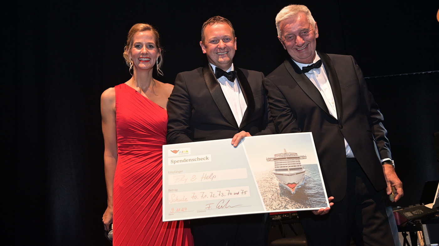 AIDA Präsident Felix Eichhorn hat bei der Spendengala der Reiner Meutsch Stiftung FLY & HELP am 9. November 2024 in Bonn für einen ganz besonderen emotionalen Moment gesorgt, als er auf der Bühne einen symbolischen Scheck zur Finanzierung der nächsten sechs AIDA Cruise & Help Schulen an Stiftungsgründer Reiner Meutsch übergeben hat.