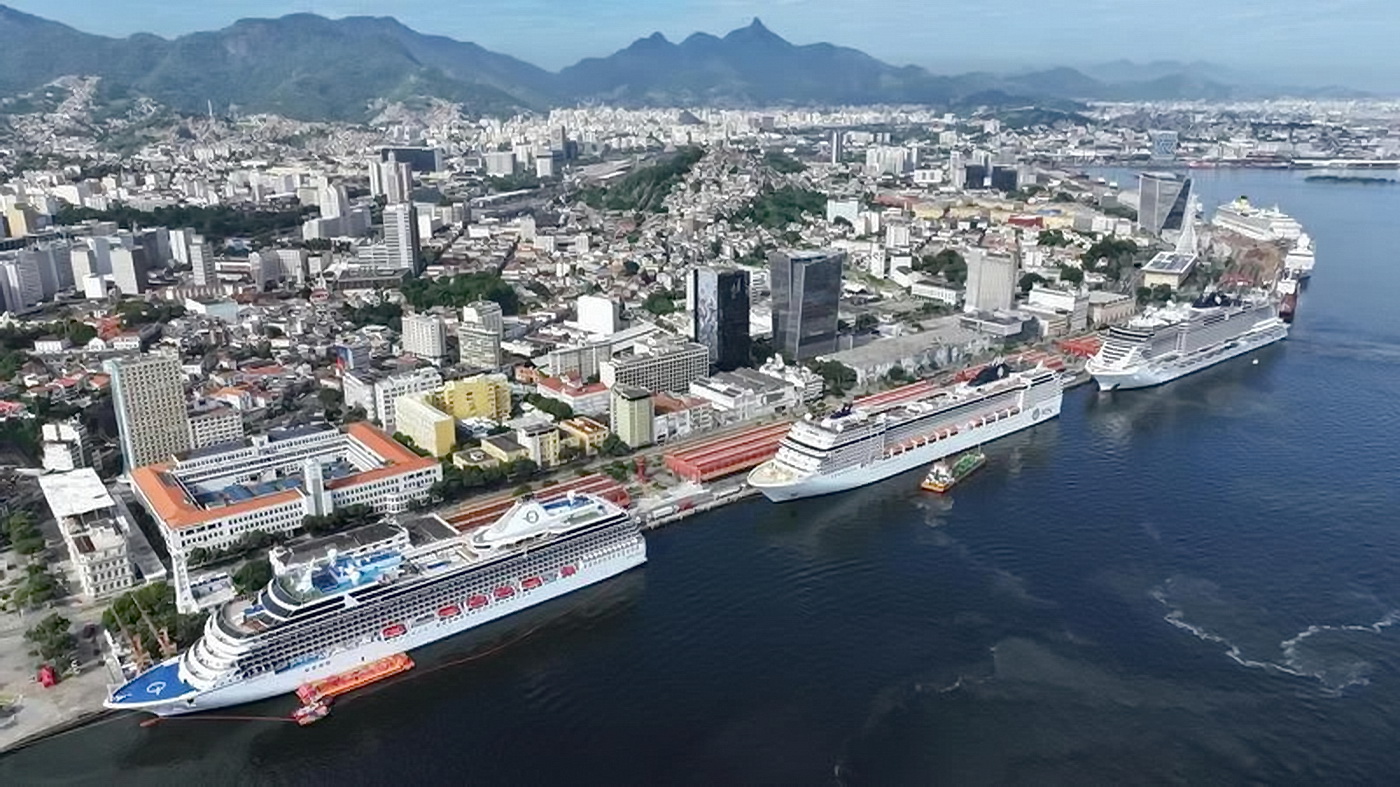 Der Hafen von Rio de Janeiro hat am 25. Jänner 2025 fünf Kreuzfahrtschiffe gleichzeitig am Pier Mauá Cruise Terminal begrüßt. An einem der geschäftigsten Tage der Saison 2024/25 wurden die Seven Seas Mariner von Regent Seven Seas, die Marina von Oceania Cruises sowie die Costa Pacifica, die MSC Seaview und die MSC Orchestra empfangen.