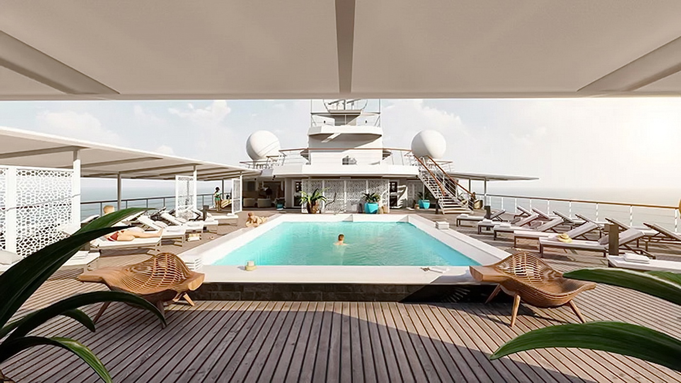 Einer der Orte an Bord, die einer umfassenden Modernisierung unterzogen werden, ist das Pooldeck, das mit einer neuen weißen Überdachung für Cabana-ähnliche Sitzgelegenheiten an der Backbordseite des Schiffes ausgestattet wird. Der Bereich erhält außerdem neue Möbel sowie eine aufgefrischte Bar, während der Pool selbst in ein neues Mosaikbanner gehüllt wird.