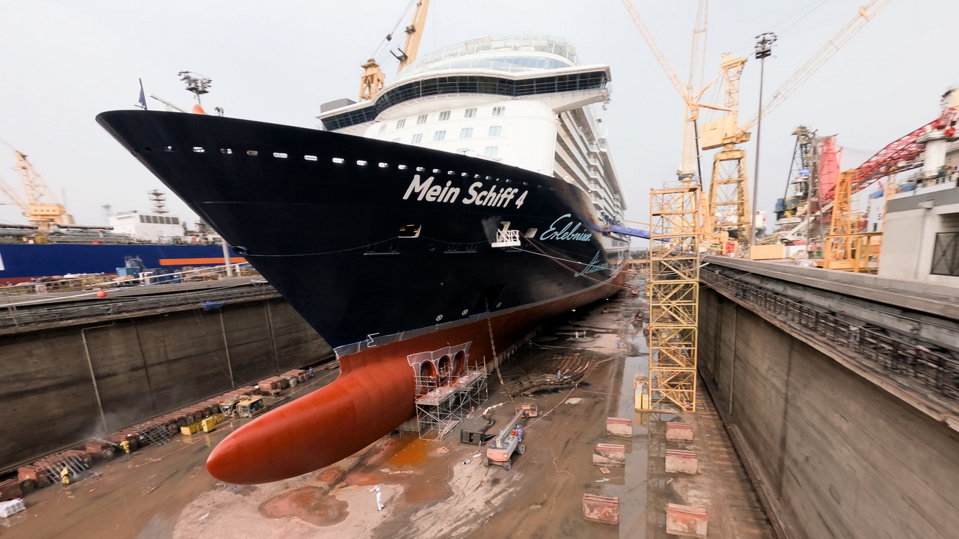 Mit Hochdruckstrahlern sind außerdem die alten Farbschichten am Unterwasserschiff der Mein Schiff 4 entfernt worden. Mit einem Wasserdruck von bis zu 2.500 Bar wurde der alte Anstrich bis auf den blanken Stahl abgetragen. Anschließend wurden vier neue Schichten, insgesamt 12.960 Liter Farbe, aufgetragen.