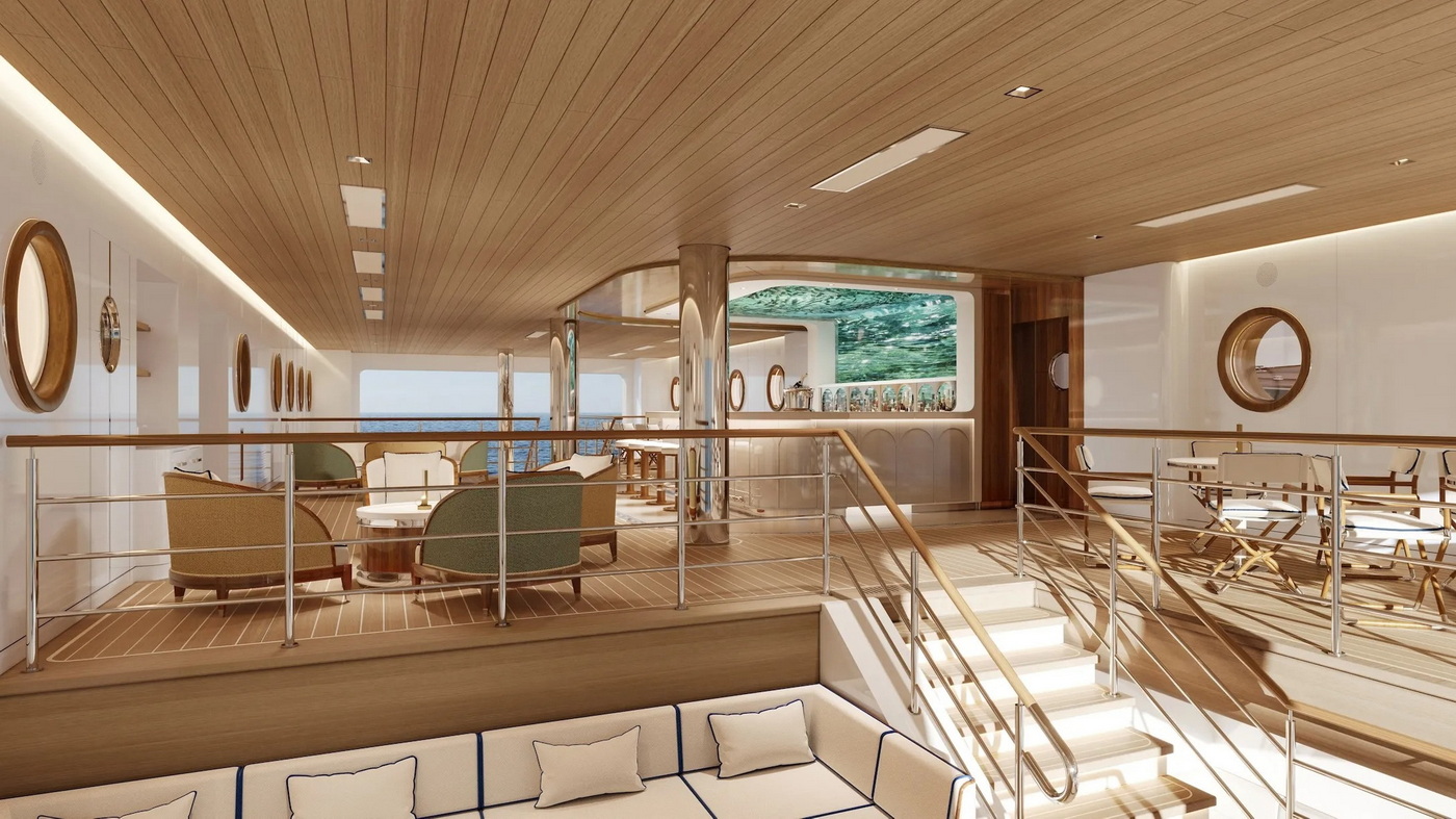 An speziellen Marina-Tagen, wenn die Yacht in ruhigen Gewässern ankert, ist dieser lichtdurchflutete Raum ein erfrischender Rückzugsort, wenn Wassersportaktivitäten angeboten werden. Wenn die Yacht an verschiedenen Orten vor Anker liegt, ist die Bar ein einladender Ort im Freien, komplett mit Sonnenliegen und Esstischen ausgestattet, die leichte Speisen anbietet. Bei Einbruch der Dunkelheit wird die Marina Bar als einzigartiges Designelement der Four Season l zur Marina Bar, ein Ort der Sternenbeobachtung unter freiem Himmel mit Cocktails und Flaschenservice auf ausklappbaren Plattformen möglich macht.