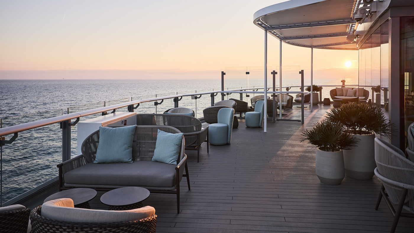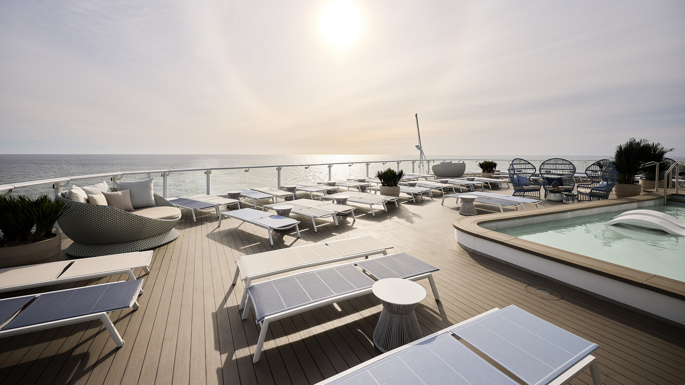 Wer die Sonne bereits den ganzen Tag ausgiebig in wunderbarer Atmosphäre genießen möchte, findet auf dem neuen Suiten Sonnendeck auf Deck 16 einen Whirlpool, einladende Lounge-Möbel und Liegen sowie Flachwasserbecken für die kleine Erfrischung zwischendurch. Dafür sorgen auch die Crew-Mitglieder in einer angeschlossenen X‑Bar mit einem umfassenden Getränke-Angebot inklusive Champagner.