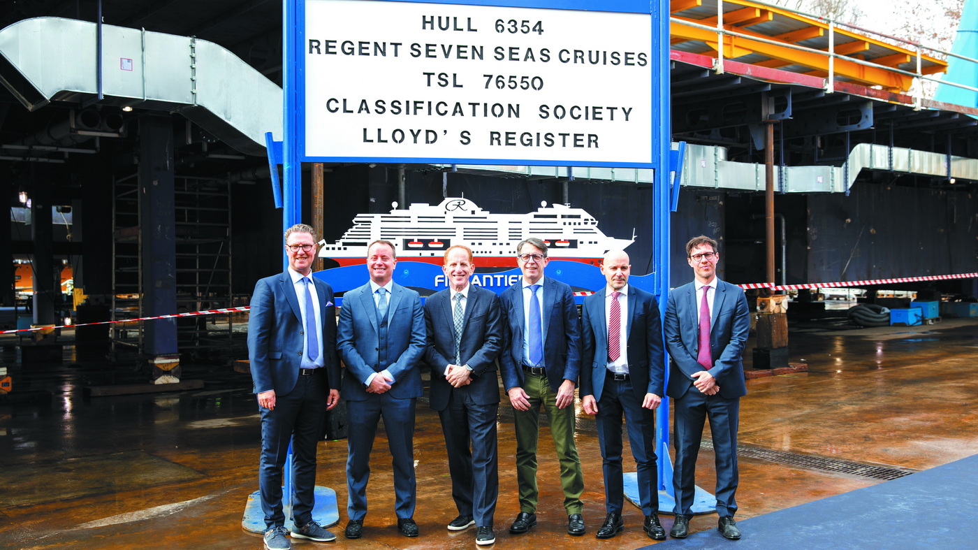 Harry Sommer, President und Chief Executive Officer von Norwegian Cruise Line Holdings Ltd, Jason Montague, Chief Luxury Officer von Regent Seven Seas Cruises, und Patrik Dahlgren, Executive Vice President, Chief Vessel Operations and Newbuild Officer Norwegian Cruise Line Holdings Ltd, Daniele Fanara, Senior Vice President New Building and After Sales, Fincantieri, Marco Lunardi, Senior Vice President Marghera Shipyard, Fincantieri, und Giuseppe Cusenza, Vice President, Project Manager, Fincantieri Merchant Ships Division, waren bei der Zeremonie anwesend.