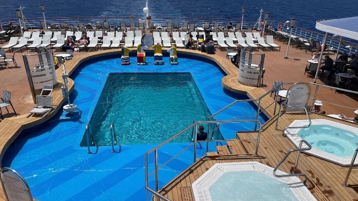 Der hintere Sea-View-Pool verfügt über neue Whirlpools, die von einem neuen Teakdeck umgeben sind, und sowohl der Sea-View- als auch der Lido-Pool erhielten eine neue Harzbeschichtung.