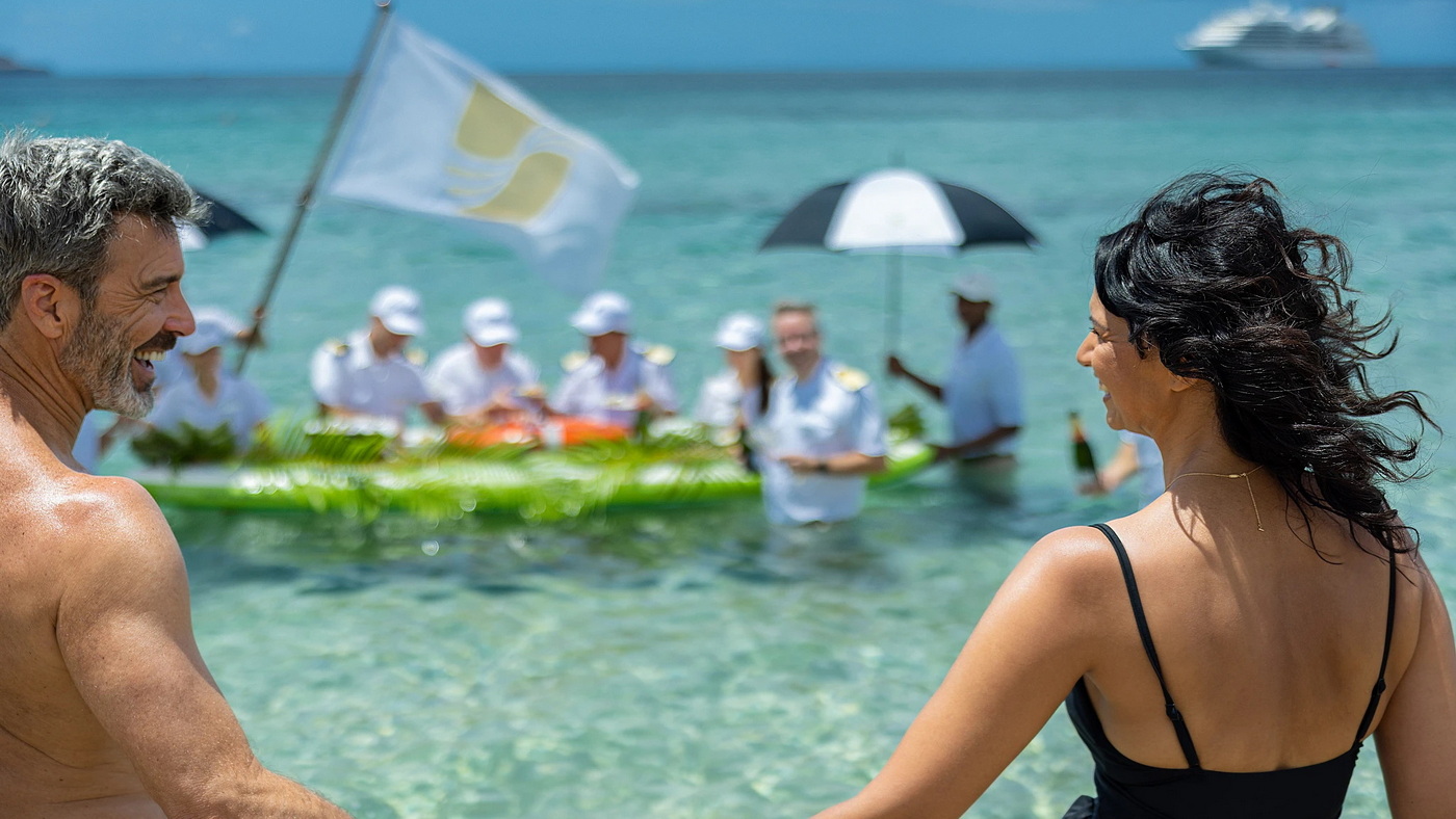 Carambola Beach, St. Kitts – Am Carambola Beach, der sich entlang des goldenen Bogens der South Friar’s Bay erstreckt, befinden sich die luxuriösesten Beach Clubs und Restaurants der Insel. Hier findet auch das für Seabourn typische Caviar in the Surf-Strandbarbecue statt, bei dem Seabourn-Offiziere, viele von ihnen in voller Uniform, auf mit Tischtüchern bedeckten Surfbrettern und mit gekühltem Champagner gefüllten Kühlern ins Meer waten.