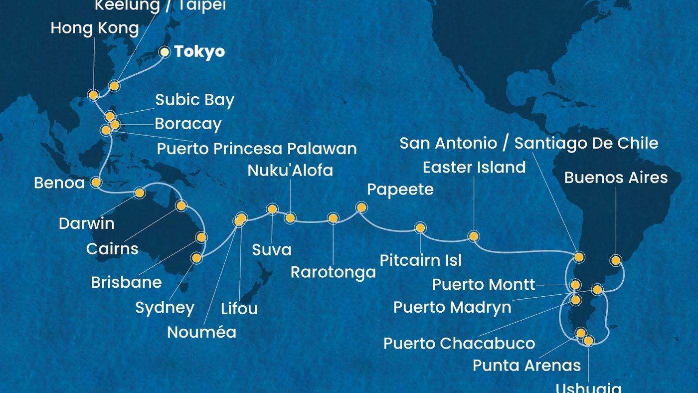 Costa Crociere hat Details zu einer 65-Nächte-Kreuzfahrt veröffentlicht, die mit der Costa Serena im Oktober 2026 in Tokio in Japan beginnt und über den Pazifik nach Buenos Aires in Argentinien führt. Zwischen diesen beiden Häfen werden Hongkong, die Philippinen, Indonesien, Australien, Neukaledonien, Fiji, Tonga und die Cookinseln besucht.