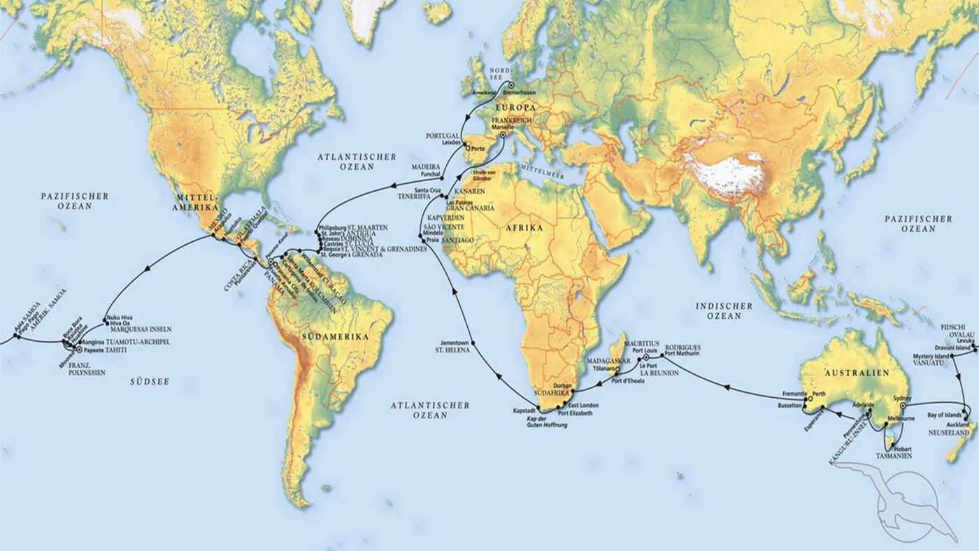 Stattdessen geht es jetzt von Port Louis nach La Reunion, Port d’Ehola, Durban, East London, Gqeberha, dem ehemaligen Port Elizabeth, nach Kapstadt für eine Übernachtung, und nach fünf Seetagen weiter nach Jamestown auf St. Helena sowie weiteren fünf Seetagen nach Praia und Mindelo auf den Kapverdischen Inseln. Danach folgen Santa Cruz auf Teneriffa, Las Palmas auf Gran Canaria und nach vier Seetagen das Ziel Marseille.