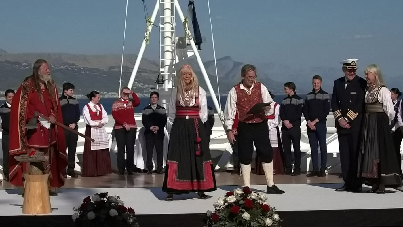 Der Tradition der Schiffstaufe entsprechend durchtrennte Lene Tangevald-Jensen während der Zeremonie mit einer Wikinger-Breitaxt ein Band, das eine Flasche norwegischen Aquavit auf dem Schiffsrumpf zerschellen ließ. Die Gäste kamen auch in den Genuss von Auftritten von Sissel Kyrkjebø, einer der weltweit führenden Crossover-Sopranistinnen und Taufpatin der Viking Jupiter, und des norwegischen Geigers Tor Jaran Apold.