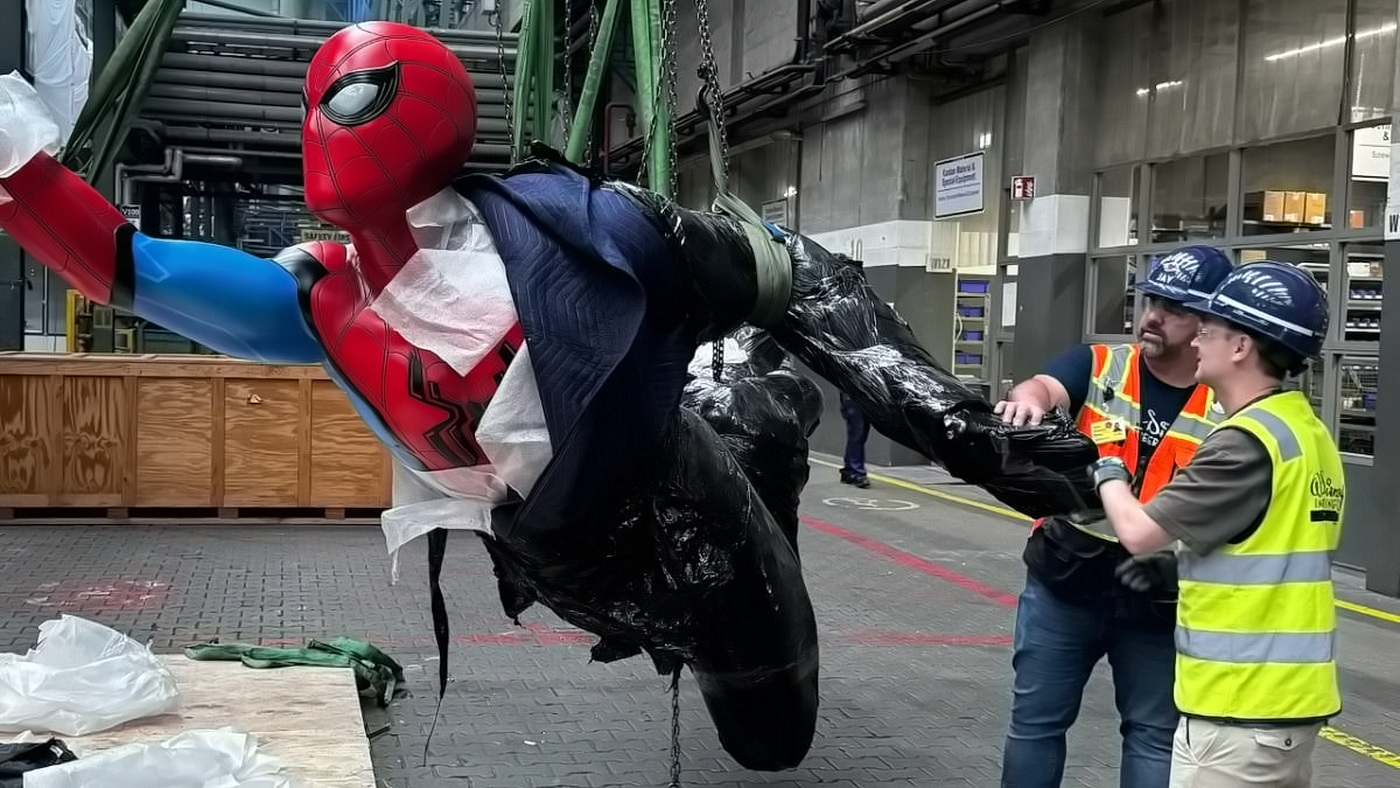 Spiderman und drei seiner Spider-Bots arbeiten jetzt hart am Heck des Schiffs ‑mit Netzschleudern, Lackierungen und einer skurrilen Kreuzfahrtausrüstung – wie Rettungsweste, Schnorchelmaske und Sonnenbrille. Die gewaltige Skulptur wurde diese Woche an ihren Platz gehoben, während Spiderman am Schiffsrumpf entlang schwamm und die Spider-Bots den Anstrich des Schiffes ausbesserten.