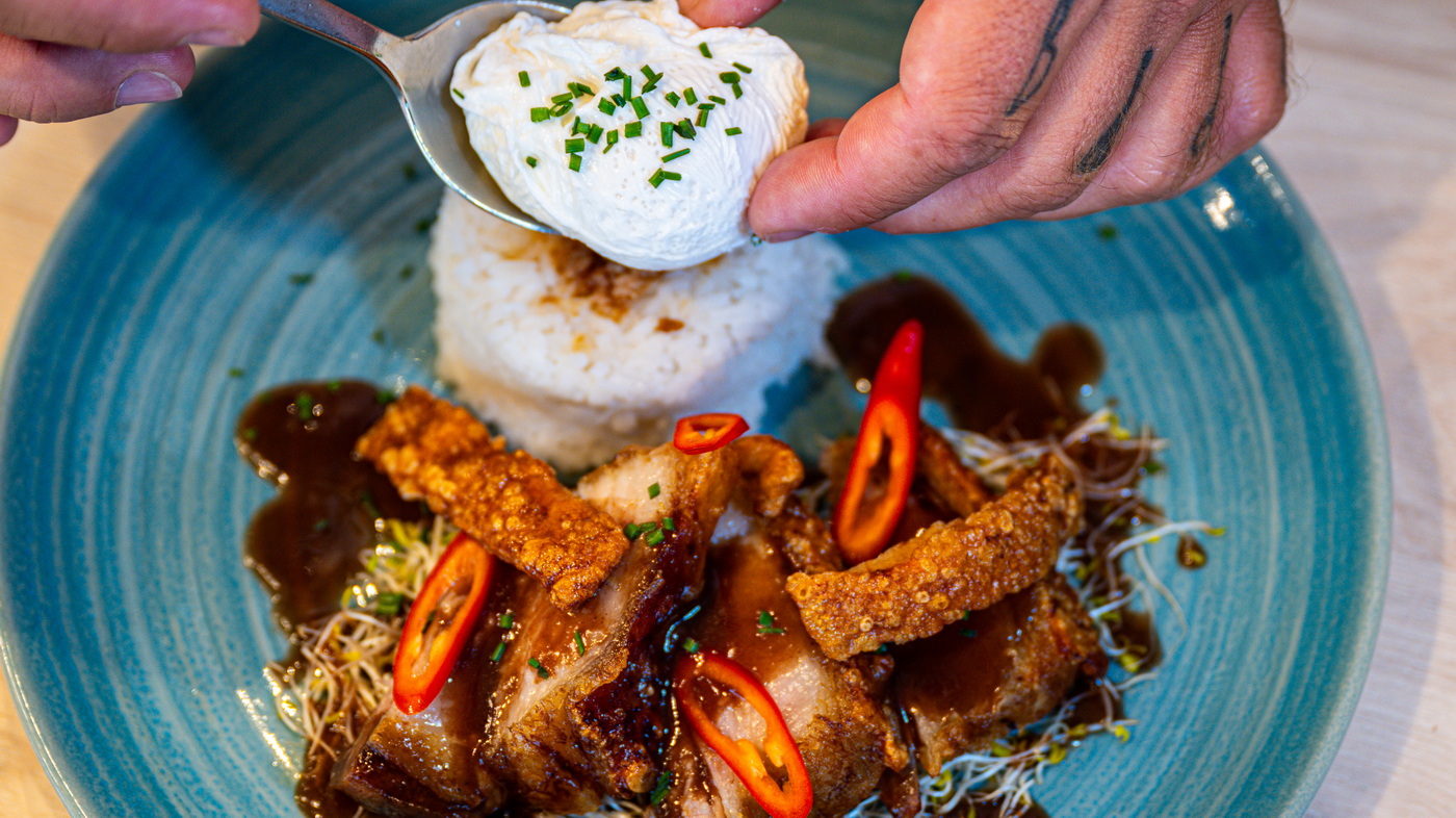 - Lechon Kawali und Adobo Duett: Knuspriger Schweinebauch mit Adobo-Sauce, Jasminreis und pochiertem Ei