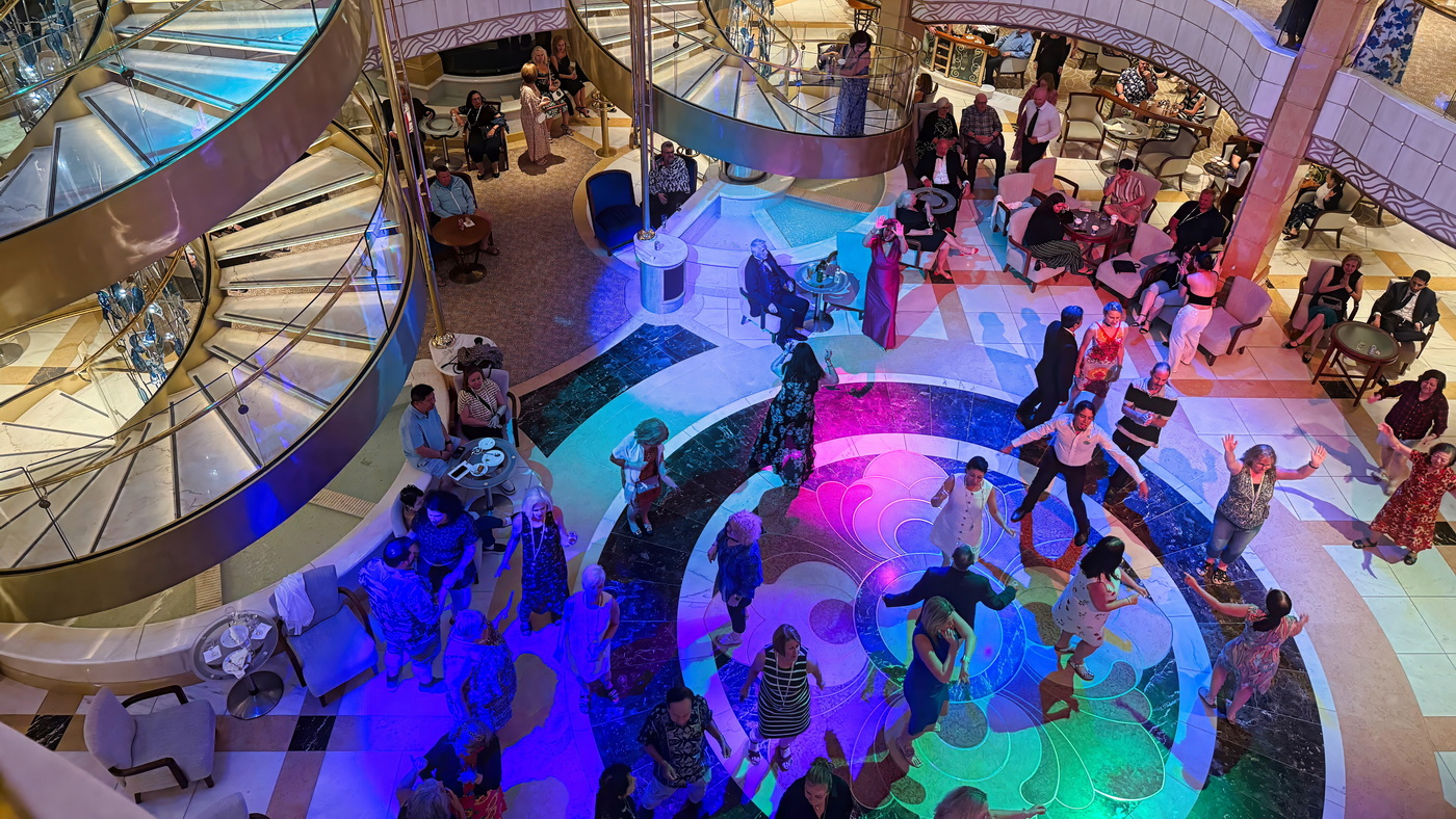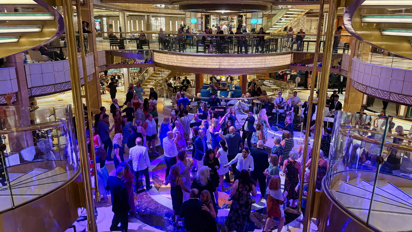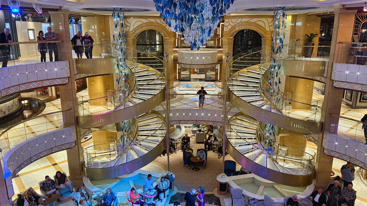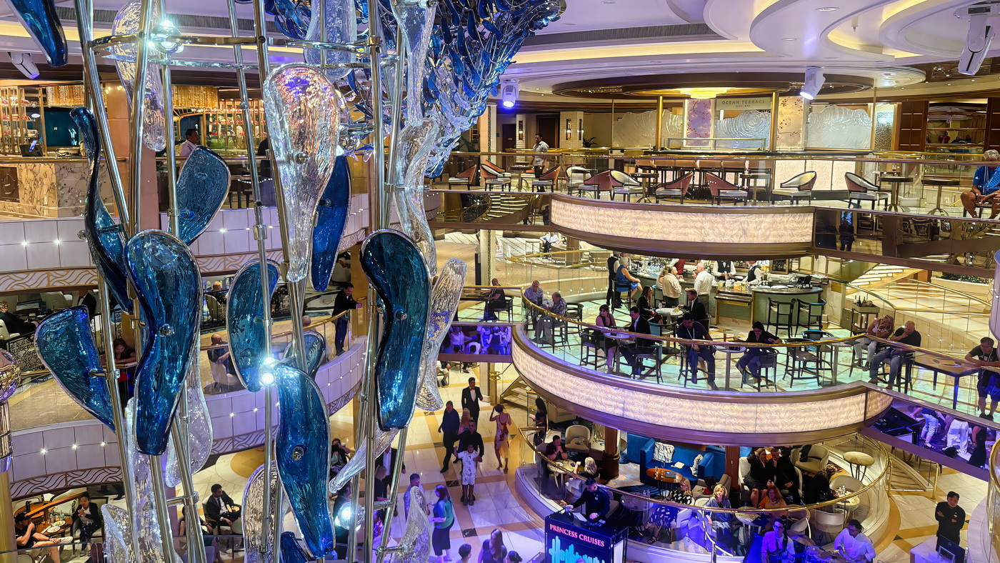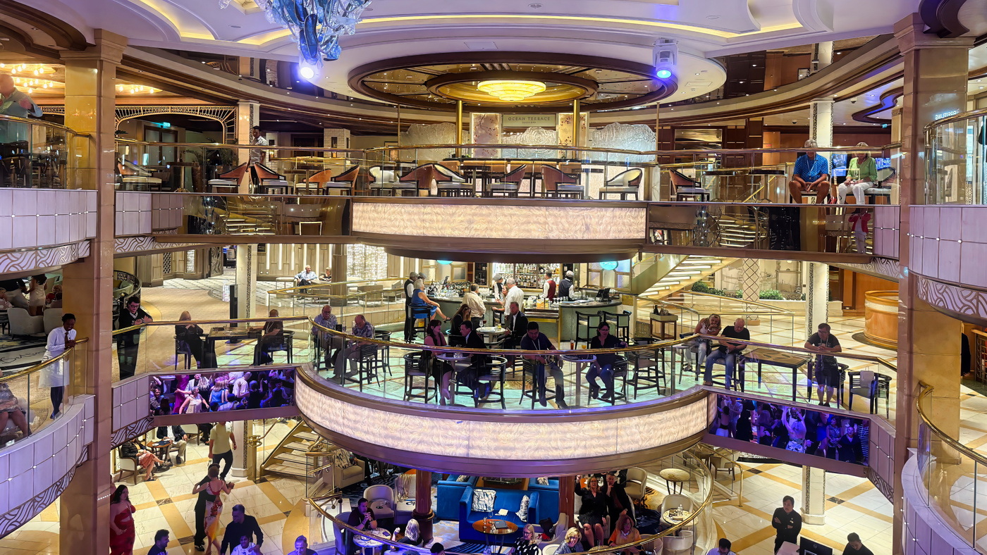 Das Markenzeichen der Royal-Klasse ist das gewaltige Atrium mit seinen gläsernen Aufzügen und geschwungenen Freitreppen, das sich über drei Etagen erstreckt und das gesellschaftliche Zentrum des Schiffs bildet. Hier befinden sich die meisten Restaurants, Bars, Lounges und Shops – und hier hat sich durch die jüngste Modernisierung auch am meisten verändert.