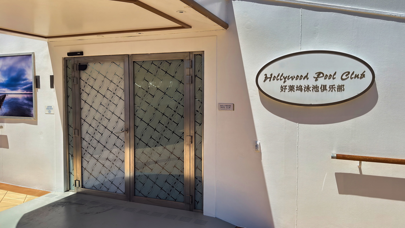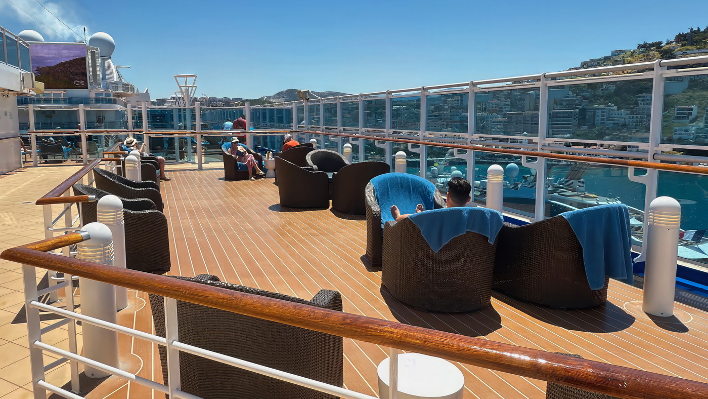 Das alles gilt auch für das benachbarte „Hollywood Conservatory“, das ebenfalls nur für Erwachsene reserviert ist. Die rundum verglaste Lounge ganz vorne am Schiff ersetzt das „Sanctuary“ der Schwesterschiffe und bietet mit ihren Tagesbetten und bequemen Sitzgelegenheiten vermutlich den besten Blick auf das Meer. Vermutlich. Denn während unserer Kreuzfahrt war dieser Bereich leider gesperrt. Warum, konnte oder wollte man uns leider nicht sagen.