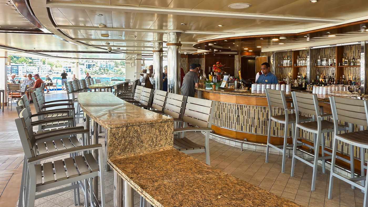 Noch nicht erwähnt haben wir die großteils überdachte und daher gut vor Sonne, Wind und Regen geschützte „Wake View Bar“ auf Deck 16 am Heck des Schiffs. Dieses Juwel ist so gut hinter dem Buffet-Restaurant „World Fresh Marketplace“ versteckt, dass es vermutlich so mancher Gast auch nach einer Woche noch nicht entdeckt hat, und eignet sich perfekt, um bei einem Drink die Blicke und Gedanken über das weite Meer schweifen zu lassen.