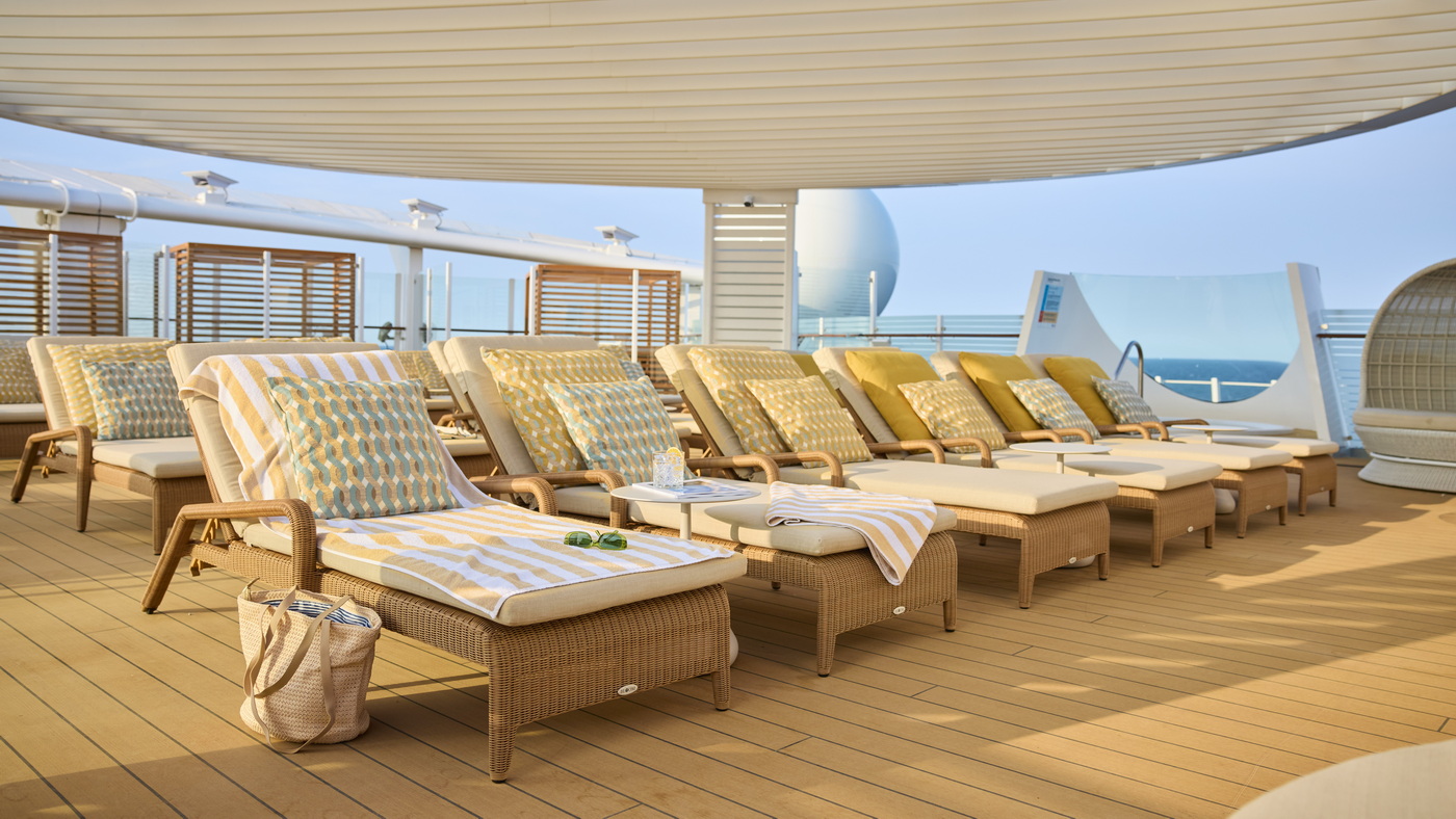 Kabinen und Suiten: Alle Kabinen erstrahlen in neuem Glanz, mit modernen Farbwelten, hochwertigen Möbeln, USB- und USB-C-Anschlüssen, sensorischen Nachtlichtern und neuen Balkonmöbeln. Die bestehenden Suiten wurden komplett neu ausgestattet mit hochwertigen Materialien für noch mehr Komfort. Neu an Bord sind großzügige Heck-Suiten mit privatem Sonnendeck, neuem Masterbad und Platz für bis zu fünf Personen.