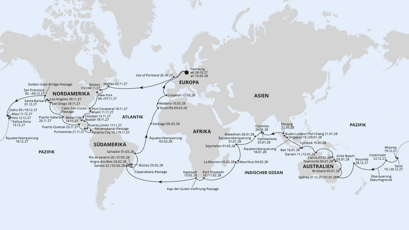 Elf Übernachtungen im Weltstädten wie New York, San Francisco und Singapur eröffnen Raum für intensive Erlebnisse. Das erste Mal auf einer AIDA Weltreise werden Panama City, Kailua Kona auf Hawaii sowie Brisbane, Airlei Beach und Townsville in Australien angesteuert.