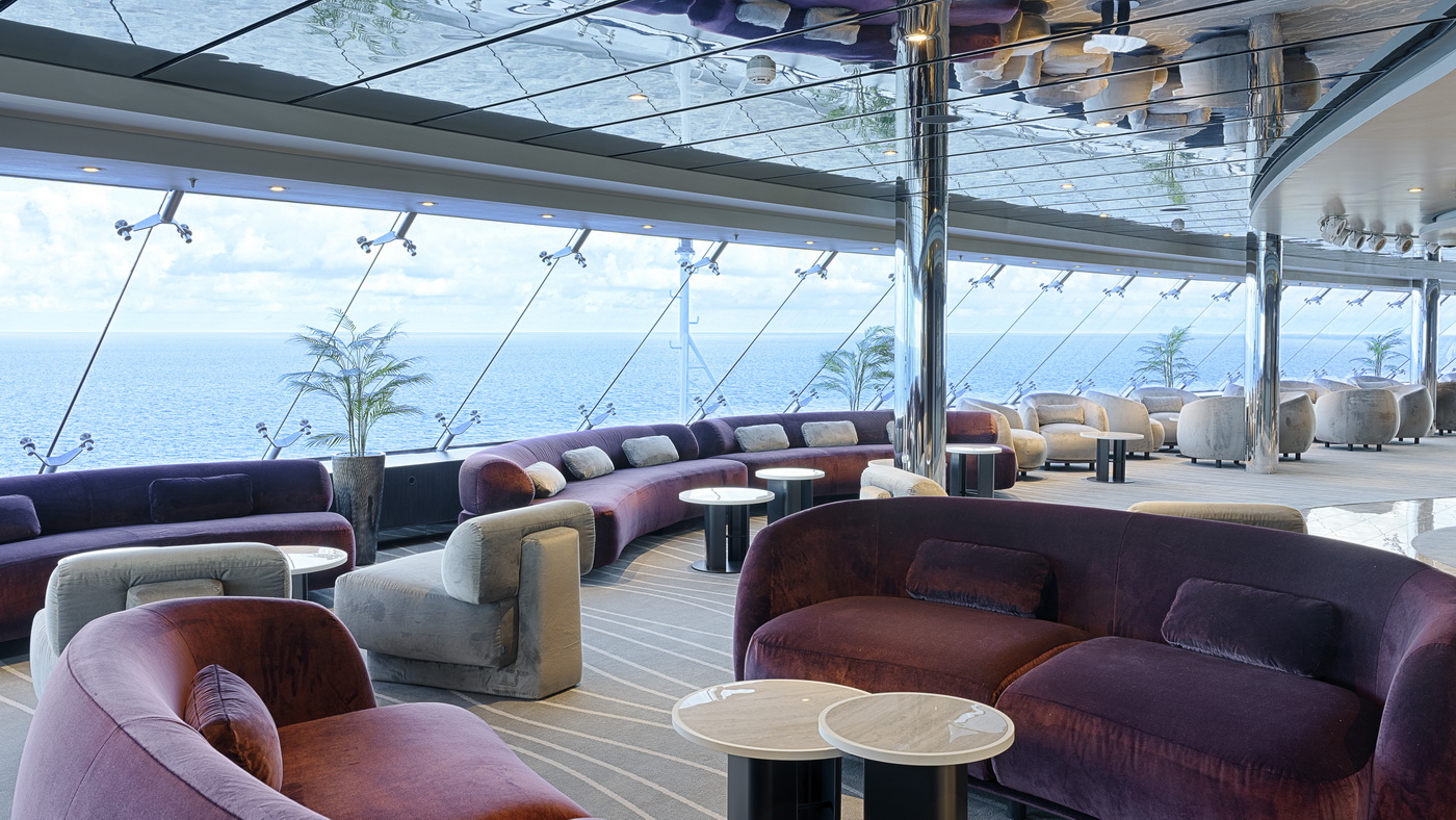 MSC Yacht Club Top Sail Lounge – Lichtdurchflutete Lounge mit bodentiefen Fenstern und Panoramablick auf das Meer.