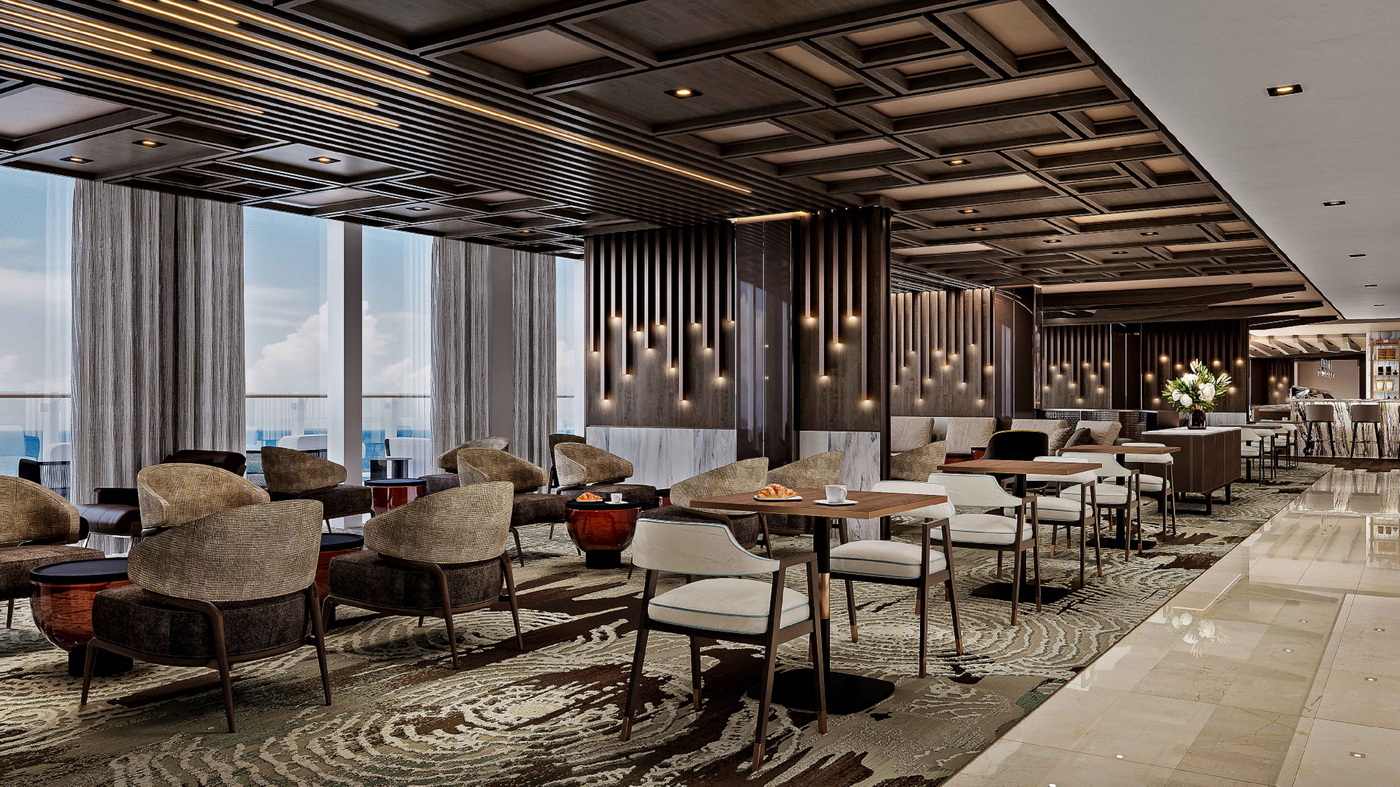Für die Explora III als skulpturales, doppelstöckiges Atrium neu gedacht, wirkt die Lobby zugleich beeindruckend großzügig und angenehm persönlich. Sie ist geprägt von fließenden Kurven, strukturierten Oberflächen und stärkeren Kontrasten aus Perlato di Sicilia- und Sahara Noir-Marmor. Kaskadierende Venini-Lüster erinnern an Gischt über der neuen asymmetrischen Treppe, die in einer eleganten Kurve zur organisch geformten, kreisförmigen Bar führt.