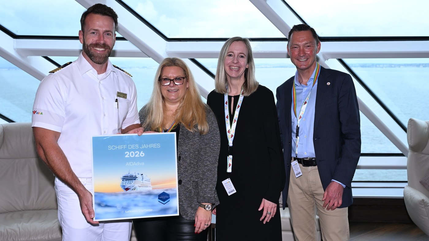 Bereits im Dezember vergangenen Jahres ist die AIDAdiva von Lufthansa City Center zum „Schiff des Jahres 2026“ gekürt worden. Nun hat die persönliche Übergabe der Auszeichnung an Bord des AIDA-Schiffs stattgefunden.