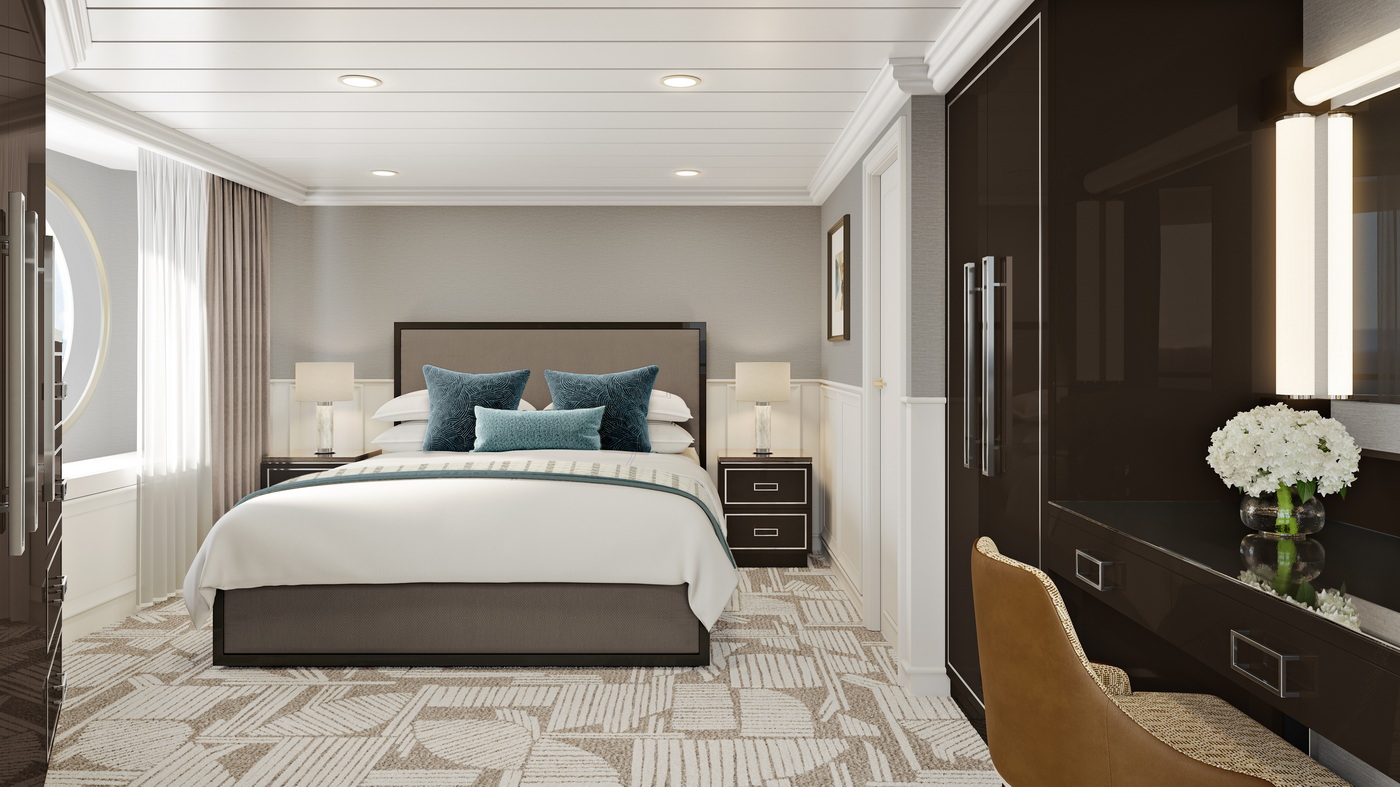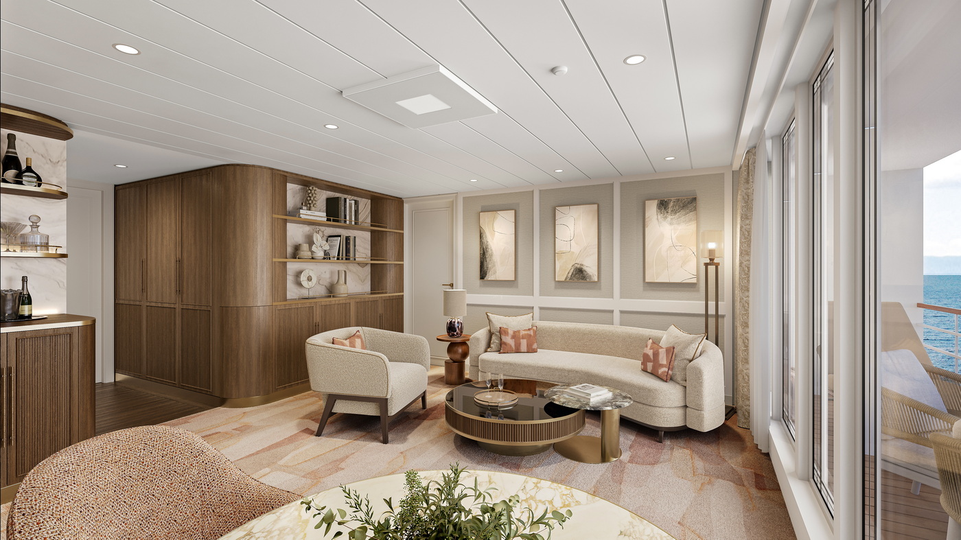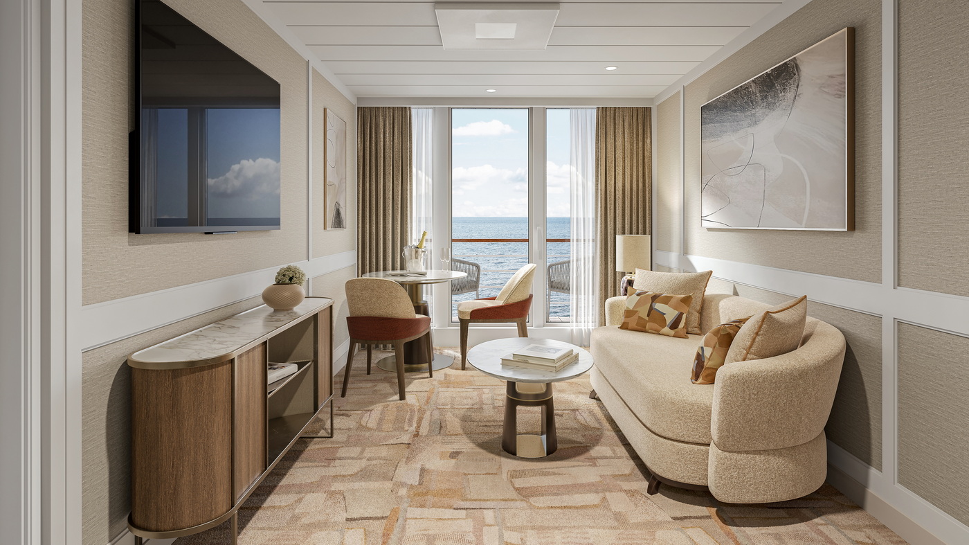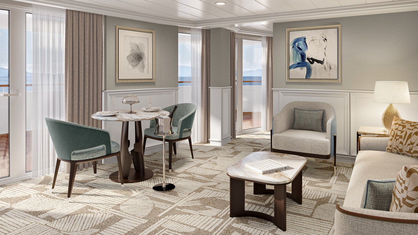 Luxuriöse Suiten mit persönlichem Butlerservice prägen das Borderlebnis. 179 der 238 Kabinen sind als geräumige Suiten gestaltet. Die meisten sind über 28 Quadratmeter groß, einige sogar bis zu 93 Quadratmeter, und viele verfügen über großzügige Wohn- und Essbereiche.