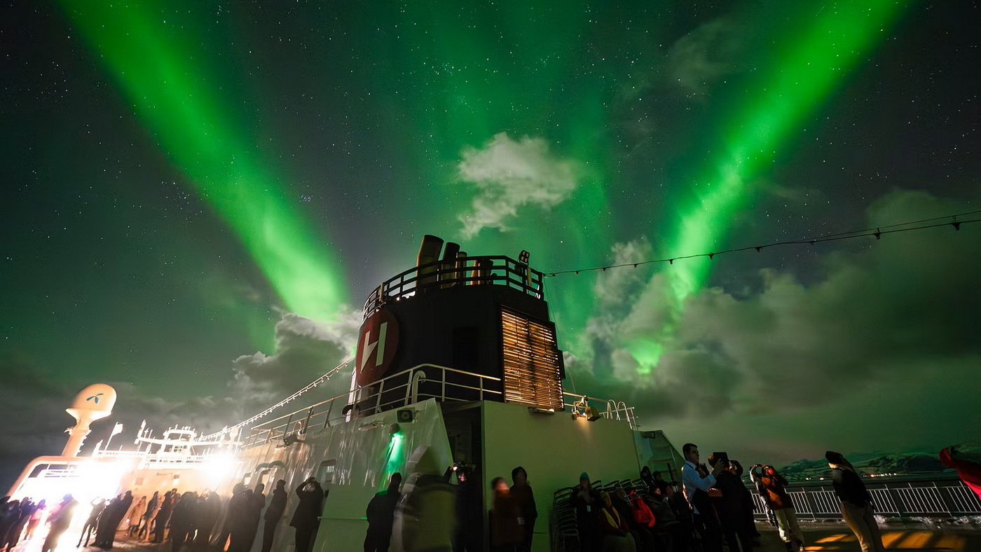 In Nordnorwegen gehören Polarlichter im Winter einfach dazu. Was Hurtigruten nun nahe Narvik aufgenommen hat, fällt aber selbst dort aus dem Rahmen, ein außergewöhnlich intensives, pulsierendes Polarlicht, das über Stunden am Himmel stand und zu den längsten jemals aufgezeichneten Ereignissen dieser Art zählt.
