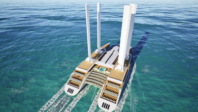 Neuer Prototyp: Kreuzfahrtschiff als Katamaran mit vier großen Segeln